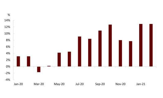 隨著供給端的調(diào)控,鋼材的供求基本面將更加趨于平衡。去年因疫情而大幅增長的鋼材庫存將獲得緩解。在需求端,我們預(yù)計(jì)全年鋼鐵實(shí)際消耗量增長約2%。隨著房地產(chǎn)進(jìn)入完工周期與財政擴(kuò)張小幅收窄,建筑相關(guān)的鋼材需求如螺紋鋼等將放緩。制造業(yè)將在出口與制造業(yè)投資復(fù)蘇的帶動下保持著自去年下半年以來的景氣度,拉動對板材的需求。