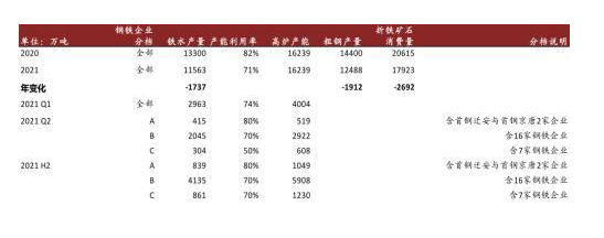 工信部已表態(tài)確保2021年粗鋼產(chǎn)量將同比下降[2]。我們預(yù)計(jì)今年環(huán)保限產(chǎn)將實(shí)現(xiàn)常態(tài)化。唐山市已公布的限產(chǎn)方案中規(guī)定,今年剩下的三個季度(3月20日-12月31日),23家鋼鐵企業(yè)將被施以30%或50%的限產(chǎn)措施(按照產(chǎn)能利用率70%或50%計(jì)算)。我們粗略計(jì)算,全年唐山生鐵產(chǎn)量將比去年減少1700多萬噸,粗鋼產(chǎn)量減少約1900萬噸,折合成鐵礦石需求則減少約2700萬噸。